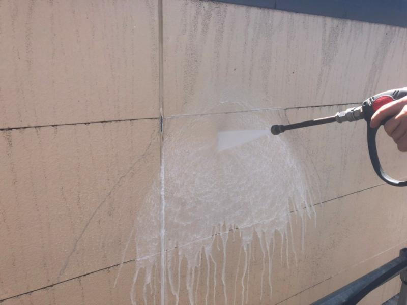 外壁のバイオ高圧洗浄。水の高圧洗浄とは異なり、ガイソーパワークリーナーを使用した洗浄はカビ・コケを根こそぎ落とします。