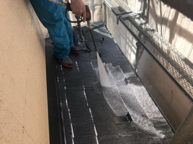 屋根もガイソーパワークリーナーで高圧洗浄します。汚れをしっかりと洗い流す事で塗料の密着度が上がり、より長くお家を守ることに繋がります。