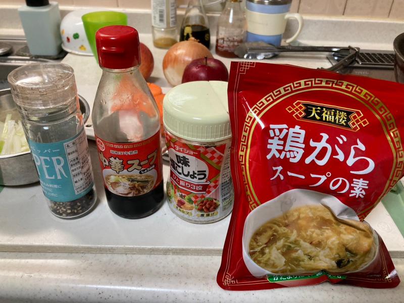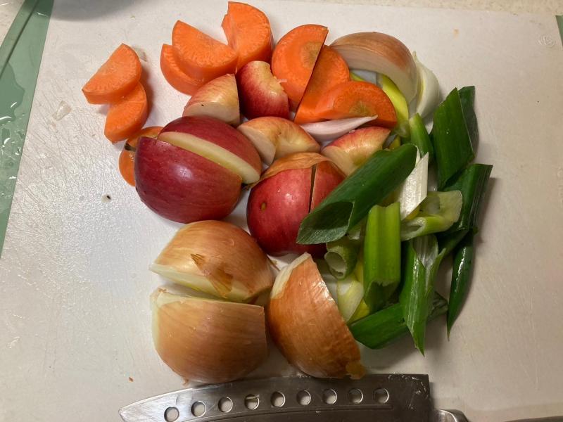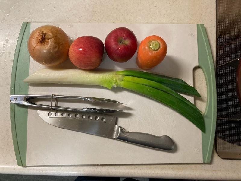 まずは、冷蔵庫の野菜室を開けて、中途半端な長ネギ・人参を取り出し、リンゴが余っていたので、リンゴ・・と、とりあえず玉ねぎで、