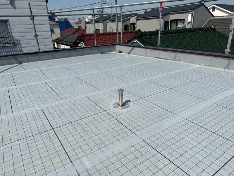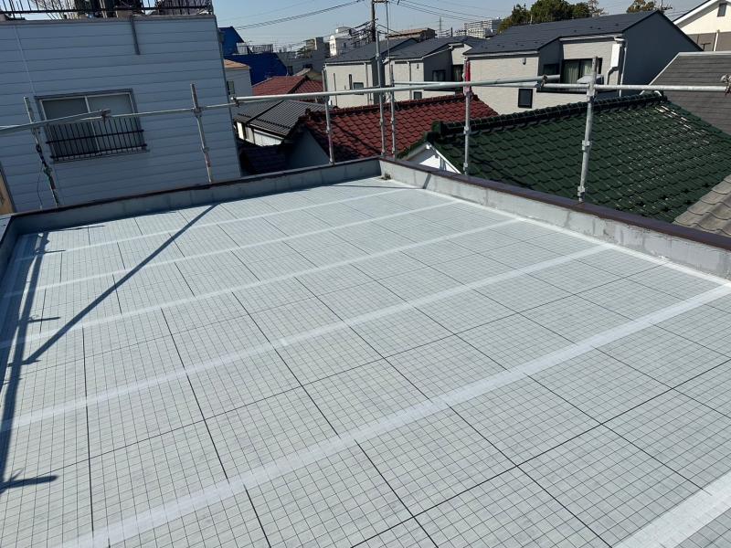 自着シートを敷くことで防水層の浮きを防ぐ働きをしてくれています!
